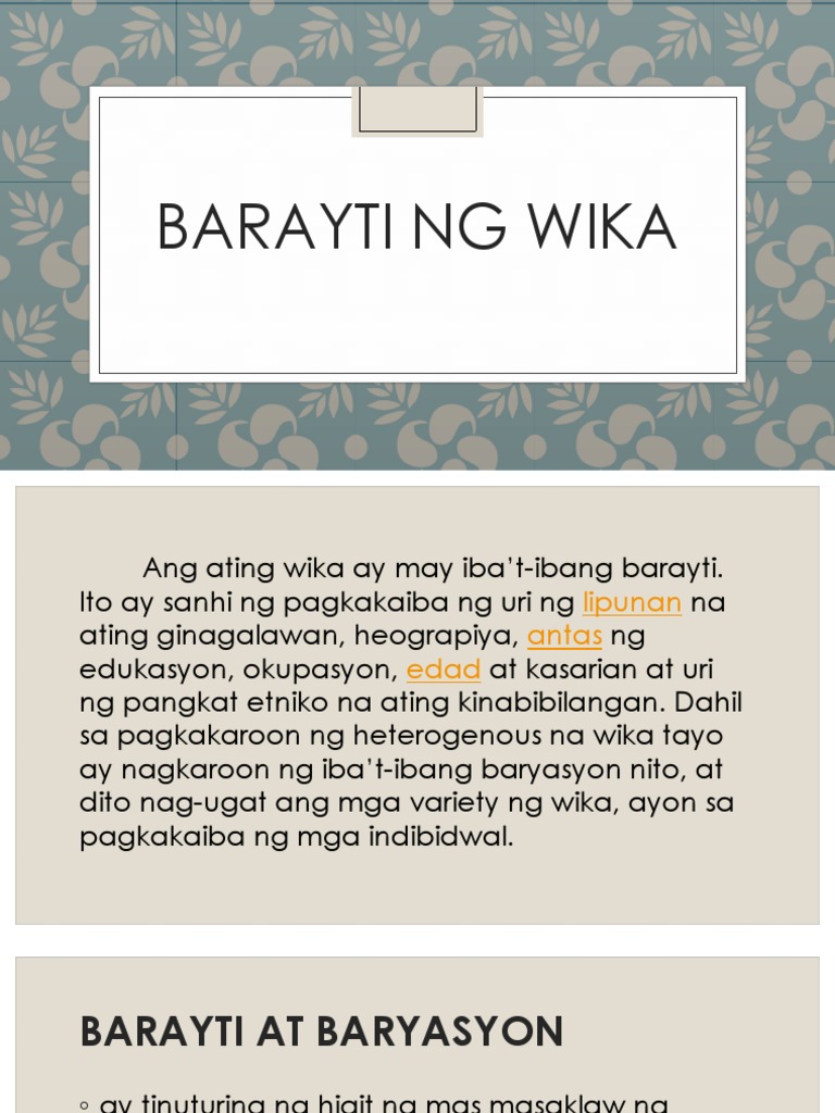 Start studying Filipino Barayti ng Wika. KAHALAGAN NG WIKA Sa paksong ito ating alamin at tukasin ang kahalagahan nga wika sa ibat ibang aspeto o angulo ng isang partikular na bansa. Sa Heterogenous naman ay nauuri ang mga wika sa ibat ibang baryasyon o barayti.