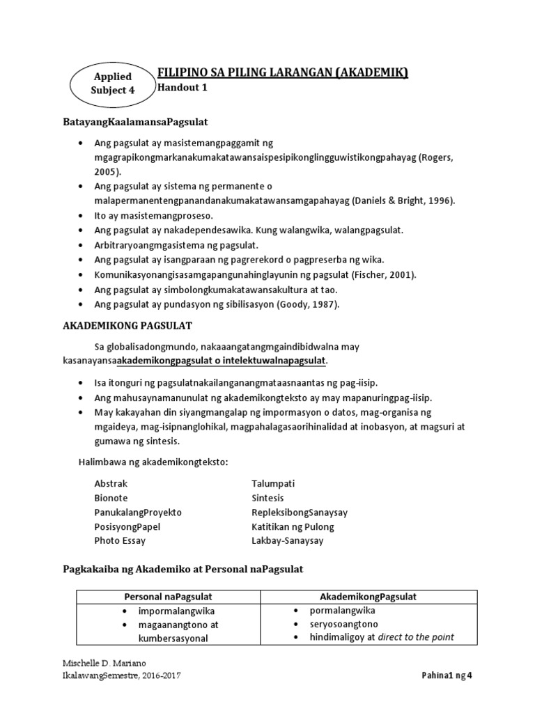 Handout Filipino Sa Piling Larangan Pdf