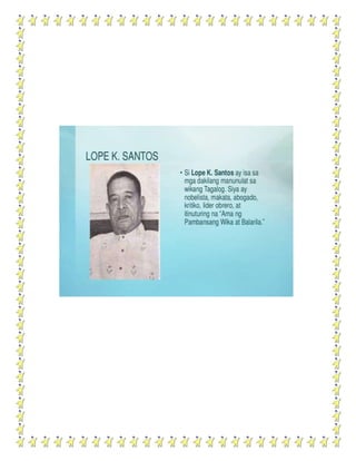 Kilala siya sa kaniyang pagiging malikhain at pagkadalubhasa sa paggamit ng liwanag sa. Ang mga nobelang ito ay ang Noli Me Tangere at El Filibusterismo. Mga Kilalang Pilipino sa Sining at Panitikan May malaking kahalagahan ang sinig at kultura sa buhay ng bawat Pilipino.