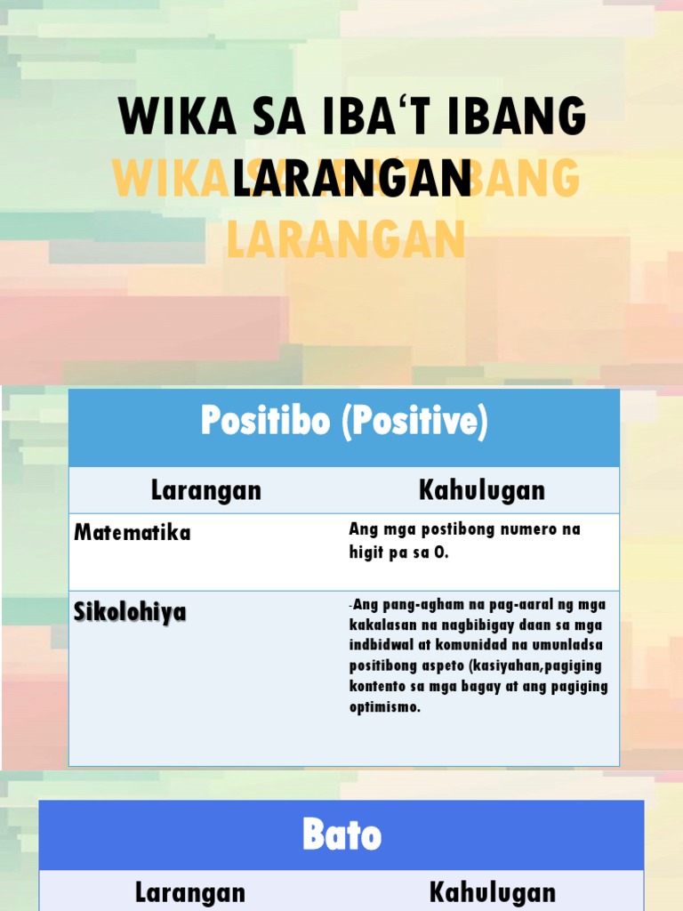 Mga Rehistro ng Wika sa Ibat Ibang Larangan Ang isang salita ay maaring magkaroon ng ibat ibang kahulugan batay sa ibat ibang field o larangan. Ang sanaysay sa english ay Essay which means a short analytic descriptive or interpretive piece of literary. Natutunan ko din ang ibat ibang barayti ng wika.