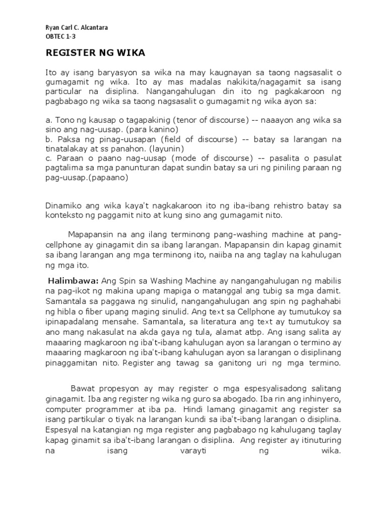 REJISTER NG WIKA Ginagamit ang rejister ng wika sa pagtukoy ng mga varayti ng wika ayon sa gumagamit Halliday McIntosh at Stevens 1994. Paksa ng pinag-uusapan field of discourse -- batay sa larangan na tinatalakay at ss panahon. Kahulugan at mga Halimbawa 1 Idyolek.