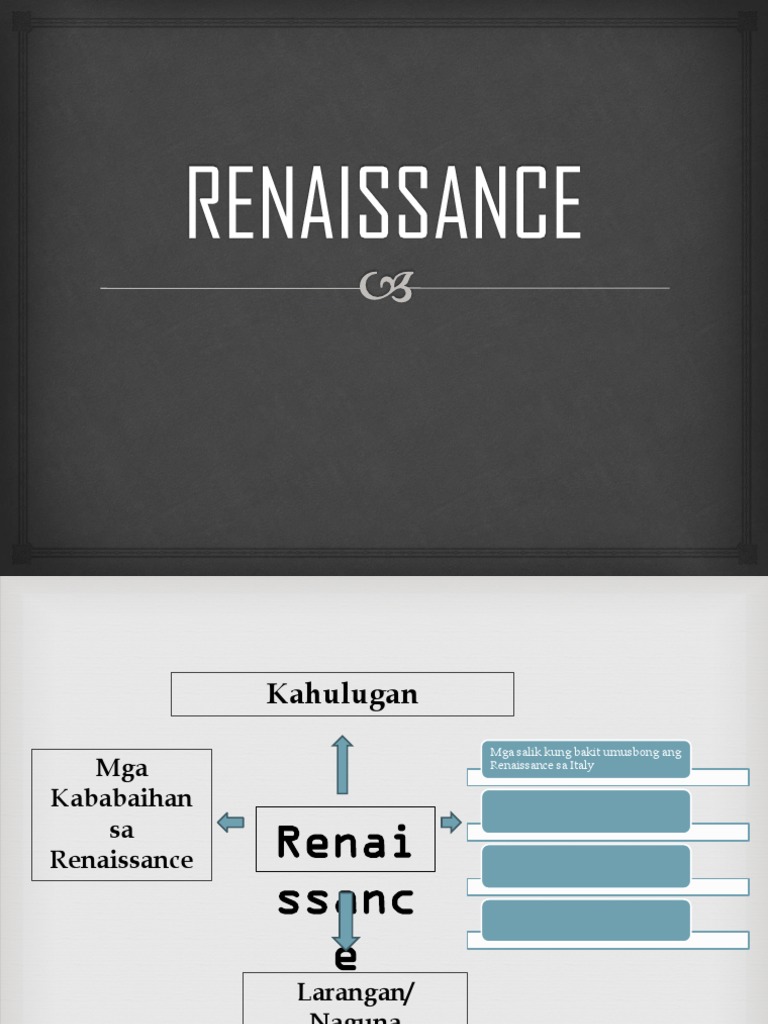 KAHULUGAN NG RENAISSANCE anu nga ba ang Renaissance. Ang Renaissance ay tumutukoy sa panahon ng kasaysayan sa Europa mula ika-14 hanngang ika-16 na dantaon. Sa pagsulat ng tula mahahalagang personalidad ng Renaissance sina Veronica Franco mula sa Venice at si Vittoria Colonna mula sa Rome.